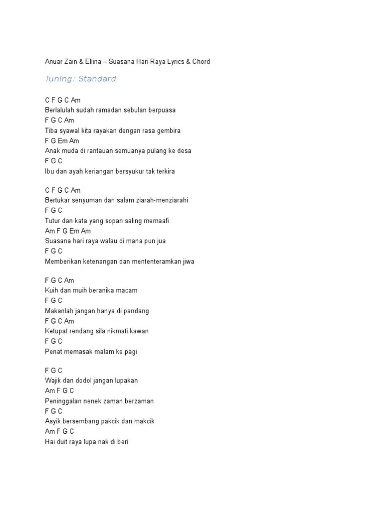 Find the best version for your choice. Suasana hari raya by anuar zain feat. Ellina key:d intro kord:d,g,a,d,bm,em,a,d ulang2x part verse start kord em lirik dan kord verse 1(anuar zain) em . Chorus am g seminggu berhari raya dm am kunjung mengunjung rumah terbuka.